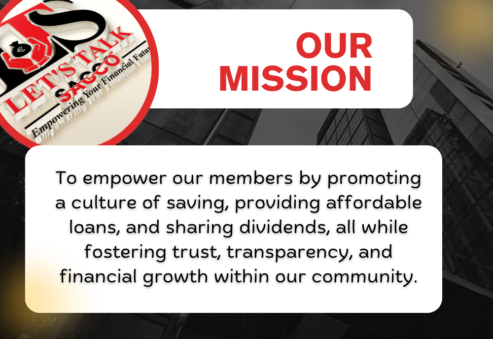 To empower our members by promoting a culture of saving, providing affordable loans, and sharing dividends, all while fostering trust, transparency, and financial growth within our community.